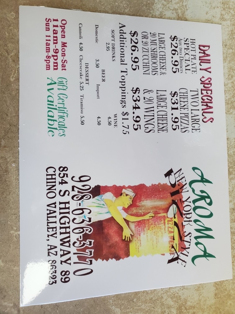 Aroma Pizza, located in the heart of Chino Valley, AZ, offers an enticing array of pizzas that delights both locals and visitors alike. Known for its crispy, tender thin crust, Aroma Pizza has garnered rave reviews for delivering consistently exceptional flavors. Diners rave about the **Monster pizza**, loaded with toppings and customizable options, such as substituting banana peppers for green peppers, creating a tailored dining experience.